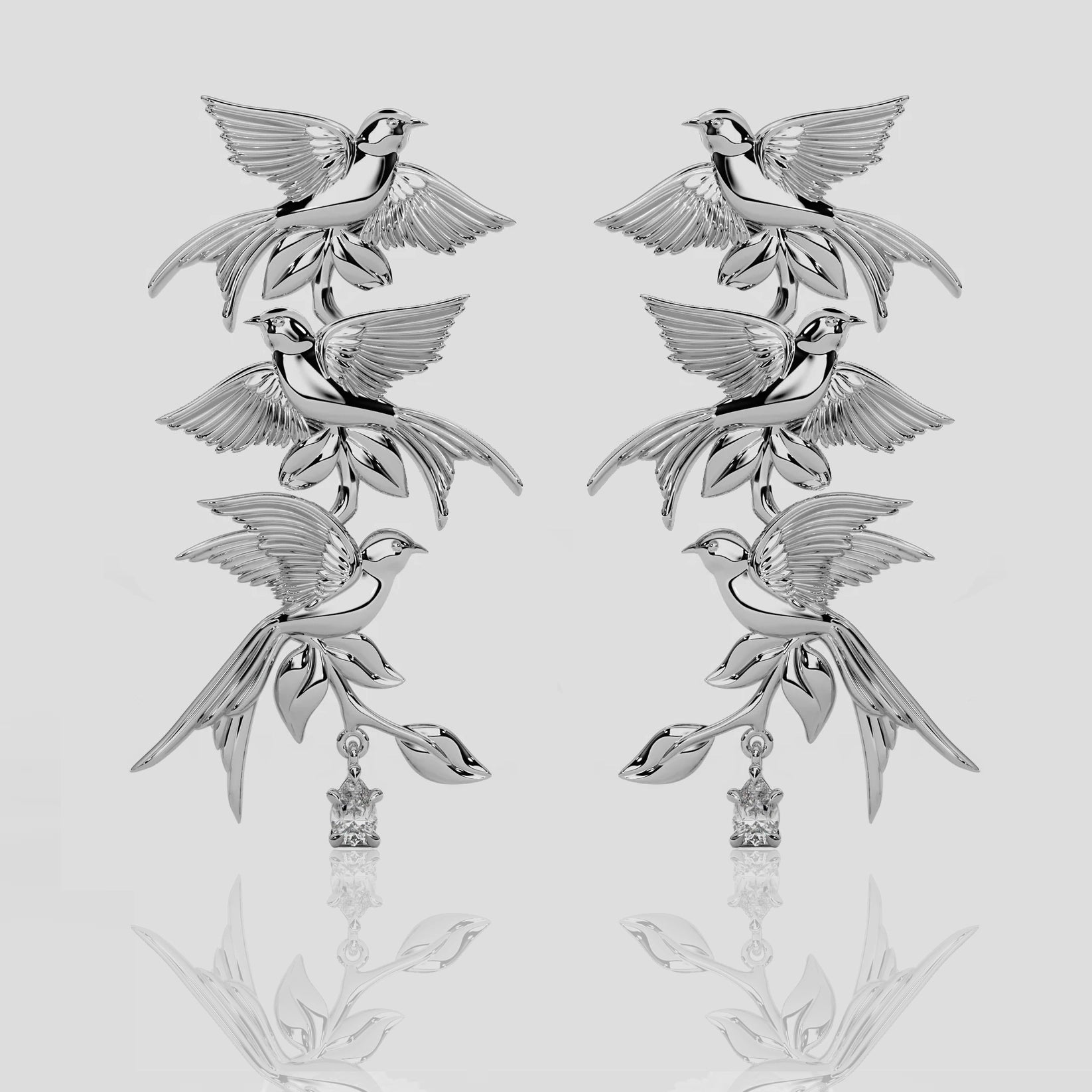 "Inspired by our signature Bird Song Earrings, I created these three-tier earrings as a sculptural alternative for those drawn to statement jewellery as wearable art. Each piece is crafted in solid sterling silver, with cascading birds designed to move and catch the light beautifully when worn.
